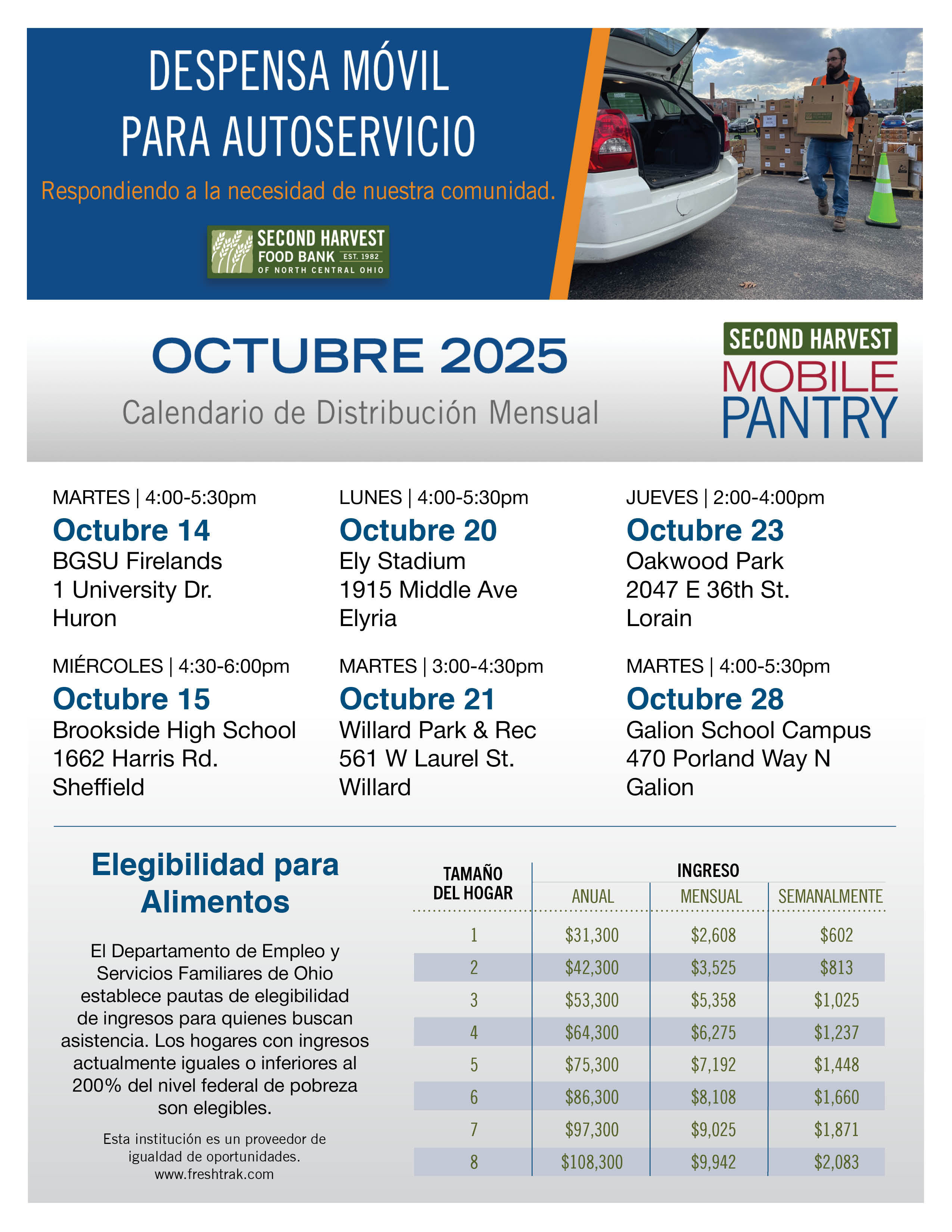 Our drive-thru mobile pantries allow Second Harvest to distribute boxes of assorted shelf-stable food, frozen meat, dairy and produce to hundreds of households throughout our service area.